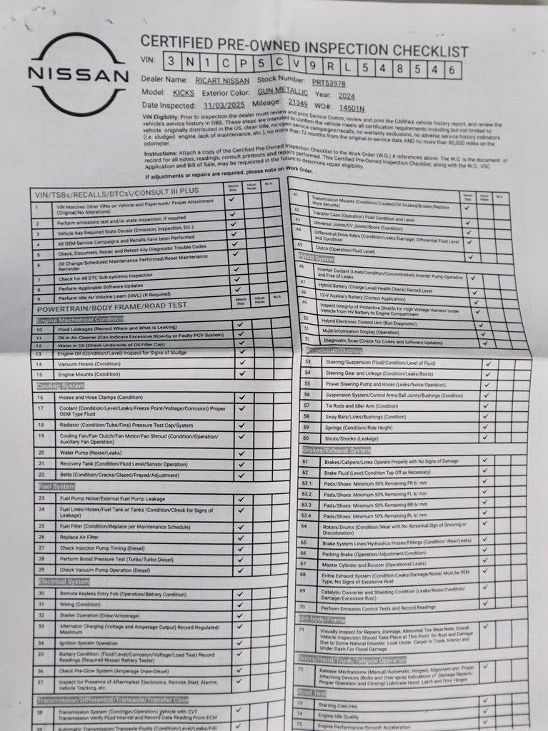 Compact, efficient, and stylishly versatile, the Nissan Kicks SV CVT brings modern convenience and advanced safety to your everyday drive. Powered by a 1.6L 4-cylinder engine paired with an Xtronic CVT, it delivers smooth, fuel-efficient performance ideal for city commuting. Inside, it features a 7-inch Advanced Drive-Assist Display, Apple CarPlay and Android Auto integration, and Intelligent Cruise Control for a connected and confident experience. Safety comes standard with Nissan Safety Shield 360, including Automatic Emergency Braking, Blind Spot Warning, and Rear Cross Traffic Alert. Finished in Gun Metallic with a Charcoal interior, this Kicks offers big capability and value in a compact, fun-to-drive package.